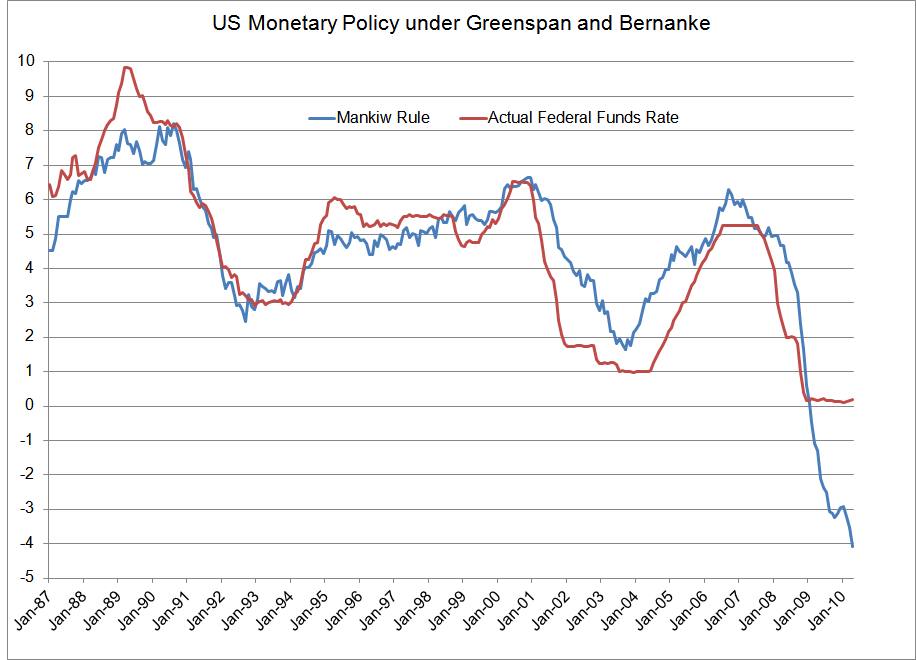 Parsimony suggests that a good Taylor rule should have 3 characteristics: it should be as simple as possible; it should use robust, easily defined, and well-known measures of slack and inflation; and it should fit reasonably well to past monetary policy. Also, to have credibility, such a rule should have “stood the test of time” to some extent: it should fit reasonably well to some subsequent monetary policy experience after it was first proposed. The Mankiw Rule has all these characteristics. It uses the unemployment rate and the core CPI inflation rate as its measures, and it applies the same coefficient to both. This setup leaves it with only two free parameters, which Greg set in a 2001 paper (pdf) so as to fit the results to actual 1990’s monetary policy. As you can see from the chart below, the rule fits subsequent monetary policy rather well, although policy has tended to be slightly more easy (until 2008) than the rule would imply.